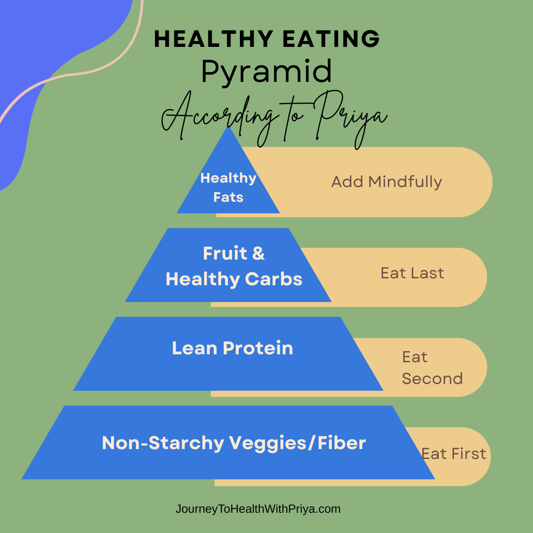 A simplified food-priority pyramid showing sequence and emphasis: vegetables first, protein second, carbohydrates next, fats added mindfully