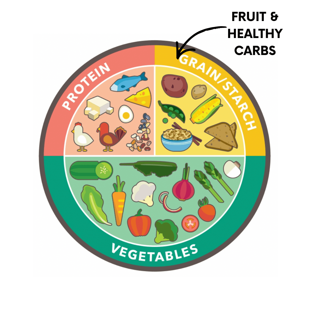 Healthy carbohydrates and fruit as supportive options, adjusted based on individual needs and tolerance. You eat this last.